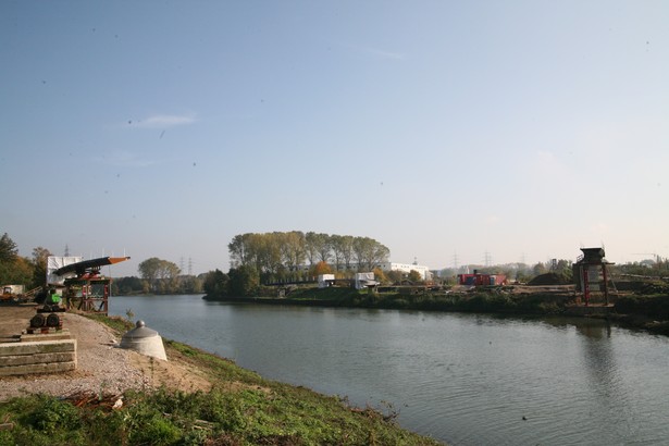 The steel parts of the channel with a floating crane were mounted on October 25, 2008.<br>The Crescent-shaped steel structure of the engineering firm Schlaich Bergermann &amp; partner from Stuttgart crossing the Rhine-Herne Canal in a semicircular curve. Hanging only on a 48 metre high steel pylon on the north side of the channel, the curving bridge has a span width of 150 metres. The Northern, 37 meter-long ramp is formed by a concrete retaining wall, made the southern, 34 m long ramp as earth-fill dam. Großbohrpfähle be installed about 600 cubic metres of concrete and 235 meters for the abutment and 400 tons of steel and 465 meter rope for slope construction.