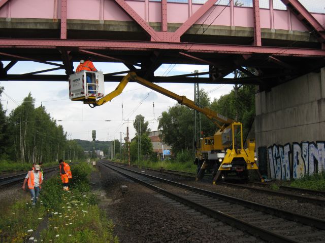 Brückenprüfung mit einem Zweiwegefahrzeug mit Hubbühne, das Fahrzeug steht auf dem nördlichen Gleis