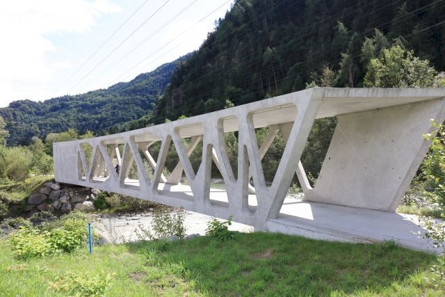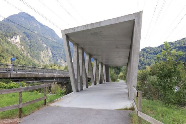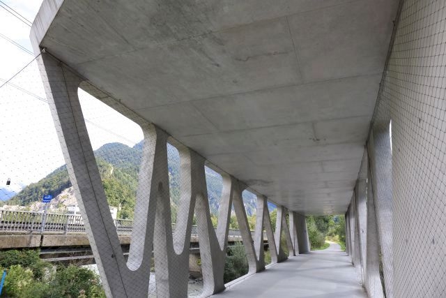 Covered timber-frame construction made of concrete. The side trusses were about 300 metres before concrete on a site and assembled on site with the local betoniertem floor and ceiling. Then they were pushed across the river. Construction costs 1.1 million euro