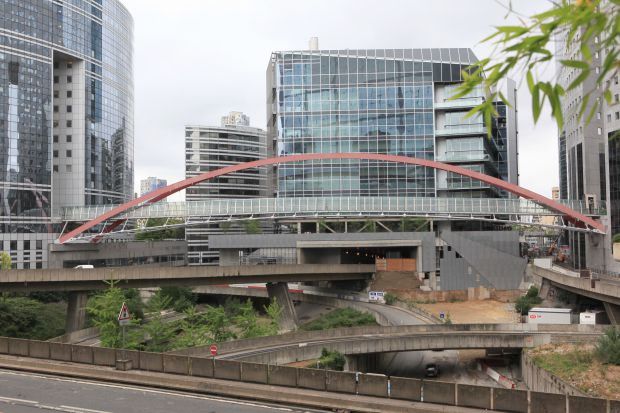 an article from the architecture guide paris:<br><br>Japan bridge<br>Already spread beyond its original boundaries, which extends business and financial district of La Defense Meanwhile westwards towards the suburb of Nanterre and from. By an extraordinary feat of planning the entire area within the boulevard circulaire is reserved for pedestrians only: all roads and railways were laid under the ground. Because however at the point where the streets behind the Grande Arche reappear at the surface, separated two adjacent office buildings are - one inside, the others outside of the boulevard circulaire-, you needed a footbridge, which should connect to each other. The Japan bridge built to this purpose is an amazing balancing act, an airy stripes over traffic flows underlying the turbulent, 15 metres below. The bridge spans 100 meters, more than seven road widths. In full speed seen by motorists, shoots the Ferrari red arrow over the artery of the taillights - an adrenaline rush of the fuels and the flotsam and Jetsam of the trade, which washes around the outskirts of Paris.<br>The steel structure rises Kurokawa's half-cylindrical tower. The main arches, welded, triangular, hollow sections, 900 mm wide, made of five parts - from the central sections and four legs. Since the facades of the building supporting the bridge are not parallel to each other, the search for an architectural coherence led to an unbalanced design: one half of the arch is longer than the other. It emerges that two elements are the same length nor the connections have the same angle. To produce this geometry as well as for the analysis of the behaviour and for making you used the help of computers.<br>Reflections on the side, acting on the glazing of the pedestrian pathway wind load as well as the necessary vertical bracing led to the design as a double arch: two bows sit together and form a stable three-dimensional structure. Arches and tendons follow parabolic curves. The separation of the parent path of the tendon enabled the Visual emphasis on the principle of the drawn bow. The crossing is held by quest, which sit on the tendons, and cleaned in the style of car washes with the help of a giant toothbrush.<br>Looking out from the bridge West, so the Emile Aillaud towers from the late sixties with their tears-shaped Windows and camouflage patterns in Pastel pink and purple promised a modernism ä la Tati's Mon Oncle, whose detailed viewing worthwhile. The sweeping overview from this place suggests a loss in however. The network of transport routes with a flurry of road-like rooms tightly over the landscape stretches: railways, pipelines, power lines, flight routes. We destroyed the sense of space for the benefit of the feeling of freedom?<br>ADDRESS behind the Grande Arche, cours Valmy, La Défense<br>OWNER Sari