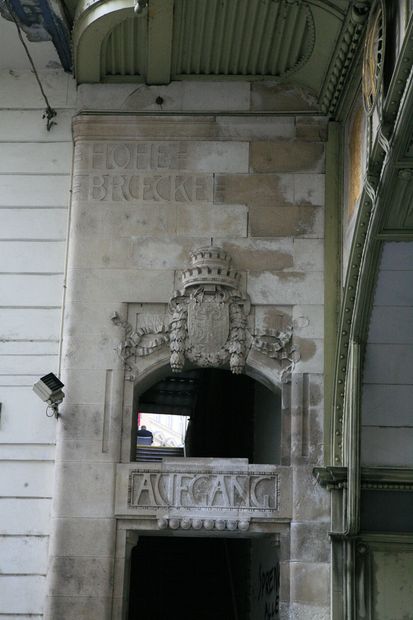 In 1903 began a renewed building, which had become necessary following a widening of the Wipplingerstrasse. Completed in 1904, the bridge was built after plans of the architect Josef Hackhofer in the art nouveau style. The external fronts were covered with marble and the bars of iron railings with ornaments. The two previous buildings were depicted in the corner areas. The inner side walls are designed as business portals with shutters, which are however pure ornament, because the depth behind the shutters is only around half a meter.