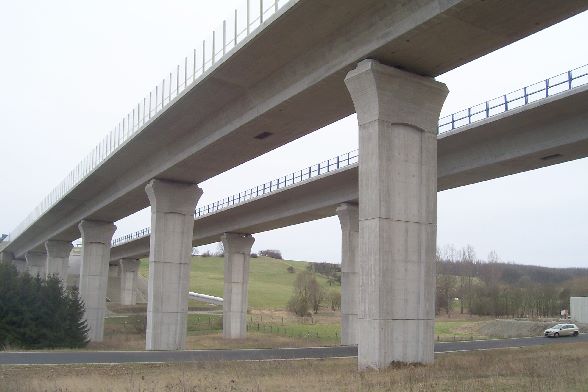 The bridge is part of the traffic project German unity No. 15 (highway connecting Kassel - Eisenach). It consists of two prestressed concrete - hollow cross-section box with only external preload (this kind of bias was used previously in Germany only in the Salm Valley bridge (<a href='./brueckenblatt.php?bas=2888' target='_blank'>BAS 2888</a>). The spans vary between 34.00 and 42.00 m, the north roadway is 15.84 m and the South roadway 15.71 m wide, both are 278 m long. The bridge consists of 7 fields of bridges and has a longitudinal slope of 3.5%. The buildings have a separate box-girder and pillar per direction road and were created in the built. The distance of the two buildings is about 29 m height above ground: up to 24 m.<br><br>Information by Heidi Zahir:<br>Bridge surface ca 7000 m m²<br>Measure length 21 m