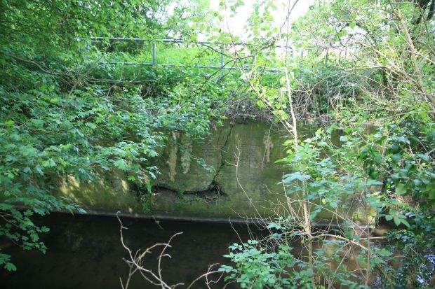 There are only two bridge abutments on the West side of the Creek, but not located in the course of the railway, but just north and South of the route. Companion way or Baustrassen was probably intended here. I suspect that the actual railway bridge was never built.<br>