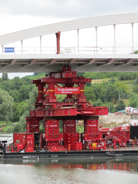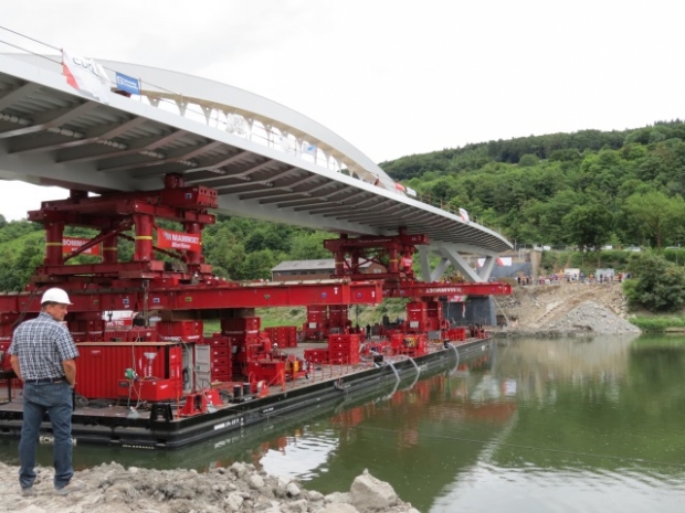 The new Moselle bridge consists of 3 parts, 2 foreland elements and a large central element. The elements of foothills of the are assembled on the Luxembourg side above the existing bridge over the building by Bernard Massard - and on the German side below the bridge on the building yard of the highway maintenance depot, as well as the large middle section in the port of Mertert. If everything goes according to plan, the 3 parts will be exposed to the 24.08.2013 on the new bridge piers and must be welded then still together.<br>The total construction time of the Moselle bridge will take probably 4 half months. Following schedule is envisaged:<br><br>22.05.2013 to 15.10.2013 full lock of the bridge<br>22.05.2013 to 04.06.2013 lock B 419 under the bridge and traffic over the two bridges ramps towards Nittel<br>10.06.2013 of the demolition of the old bridge with some of the pillars to be completed.<br>05.08.2013 The majority of the bridges should be placed on the new pillar.<br>Shipping should not be impeded by the construction of the bridge essentially.<br><br>On the 08.08.2013 the bridge was on a pontoon from the port of Mertert after Grevenmacher pushed and into its final position.