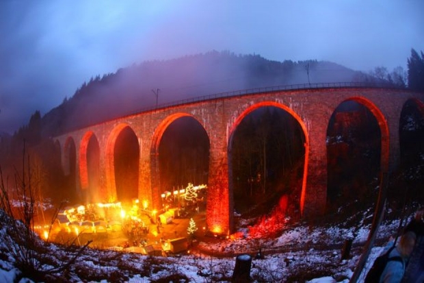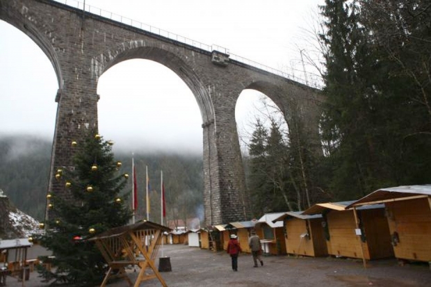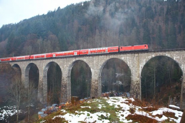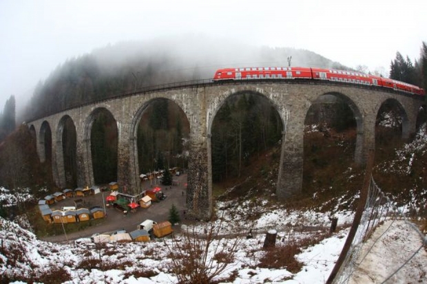 Ravenna viaduct replaced truss bridge built in 1884. Part of the Höllentalbahn (Freiburg-Neustadt / Switzerland). 9 Arches. Blown up by the army in April 1945, but renewed in 1948 in their original state.<br><br>Information by Heidi Zahir:<br>The Deutsche Reichsbahn-Gesellschaft was planning to abolish the expensive gear operating on the Hölle Valley railway at the beginning of the 1920s. For the envisaged heavy adhesion locomotives, track and bridges had to be strengthened. The 1887-built Ravenna viaduct you decided however for a complete rebuild, as was the old building in a contra-rotating arc and was allowed to be used only at 15 km/h. in 1925 work began on Dec. 14, 1927, the first train of the new viaduct rolled. 224 Feet long was the building and thus the largest railway bridge in the black forest. The distinctive viaduct crosses the romantic Ravenna Gorge with nine arches 20 m clear span. At the highest point of the track body is about 40 m above the valley floor. On April 23, 1945 so 14 days before the end of the war, German pioneers blew the pillars 3.4 and 5 and thus the vaulted 3 to 6 in the air during the retreat. Two years and eight months it took to the viaduct was rebuilt. Since then, the trains roll every day over a railway bridge, which has lost none of its elegance to the present day.<br>In 1936 it was electrically uphill.