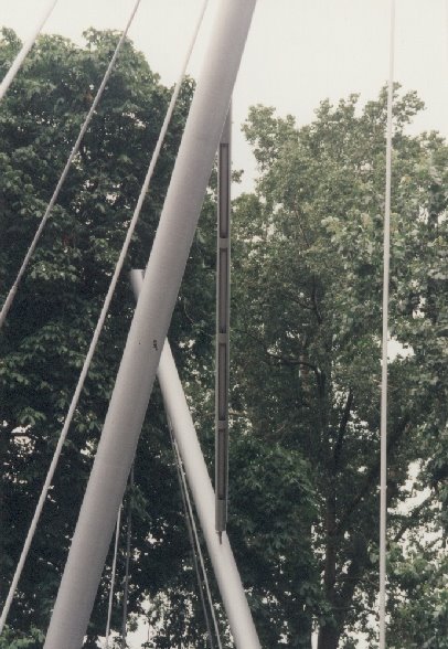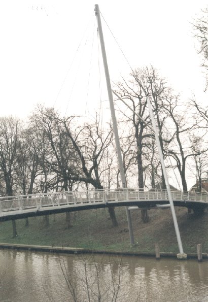 Track: 320B-Profilen with diagonal Association pick this timber-frame from 2-span. 22 Prefabricated concrete slabs as a roadway are attached on the truss<br>On 1/3 of the total length a buck from round tubes with two round "columns" is at an angle to each other, the helical ropes are attached to which.<br>