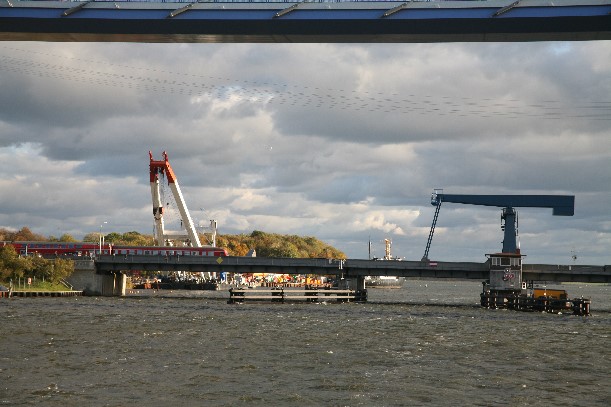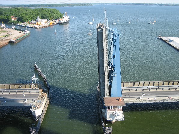 Die geöffnete Brücke von der neuen Rügenbrücke aus gesehen