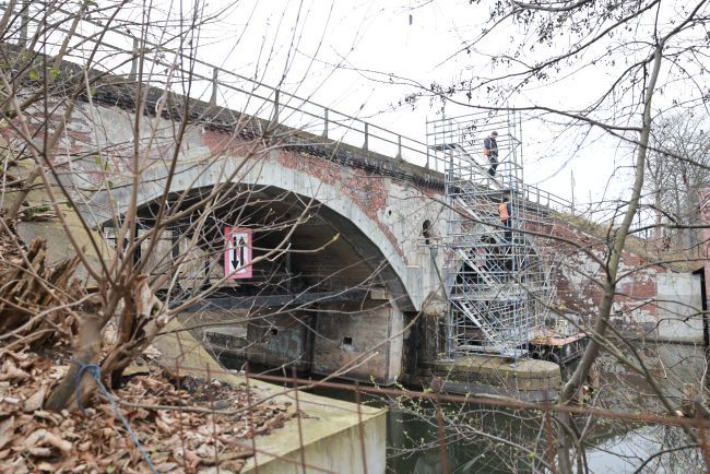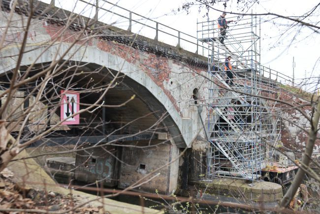 The listed railway overpass was built in 1902 as a double-track arched bridge spanning the South Canal with two arches. (See Annex 03.901.1 for the entry in the list of monuments).