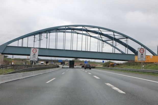 Der Stahlüberbau wurde am 10.05.2014 über den laufenden Verkehr der A3 geschoben.