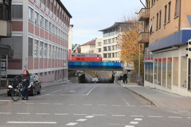 Auf beiden Seiten der Eisenbahnbrücke wurden Stahltrogbrücken für Fahrradwege ergänzt