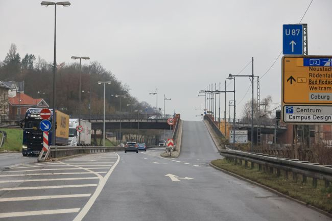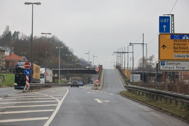 WIKIPEDIA: The plate girder of prestressed concrete spans the ITZ, the Werra railway, as well as the b 4 Federal road at the Hofbräuhaus. The main bridge with four lanes and sidewalks on both sides has a total span of 178,99 meters. The spans of the five fields are 37.48, 29,16 meters, 29,16 meters, 33,79 meters and 49.40 m. The two ramp bridge parallel exhibit three fields with a total span of 78,95 metres or four fields with a total span Federal Highway of 103,96 meters.