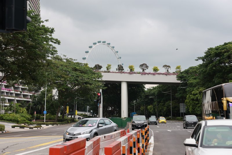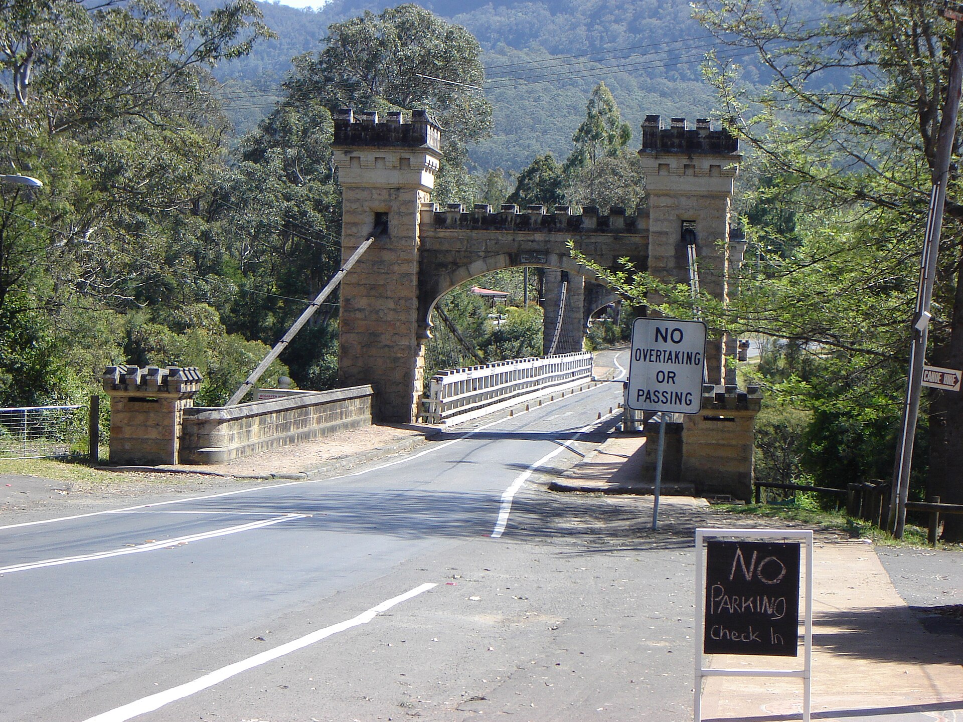 Brückentyp: Hängebrücke mit Steintürmen und Eukalyptusdeck.