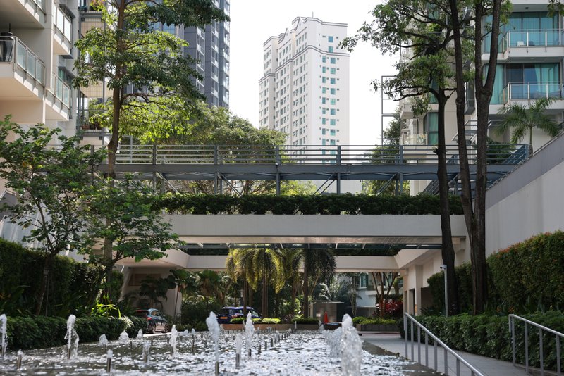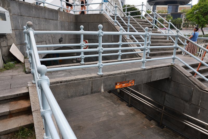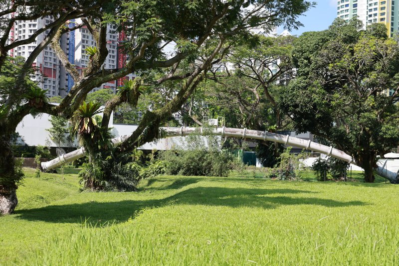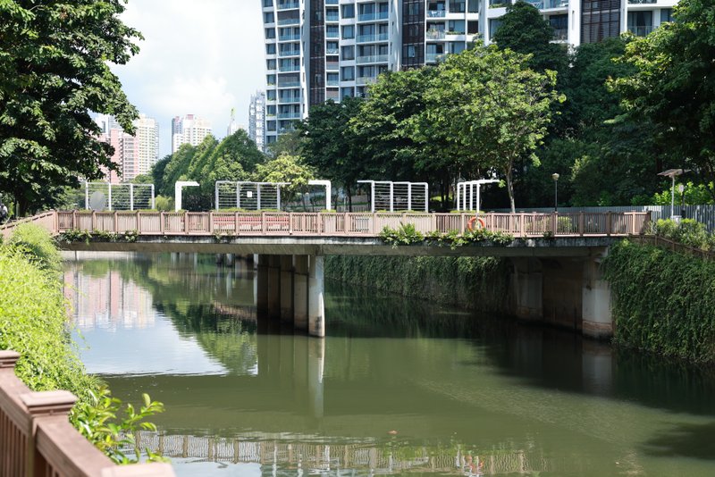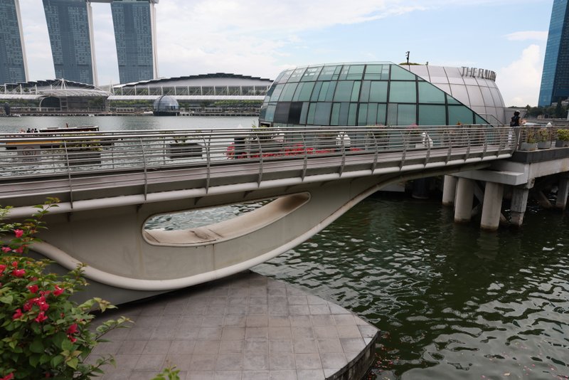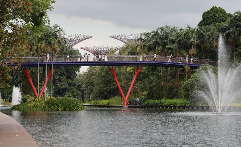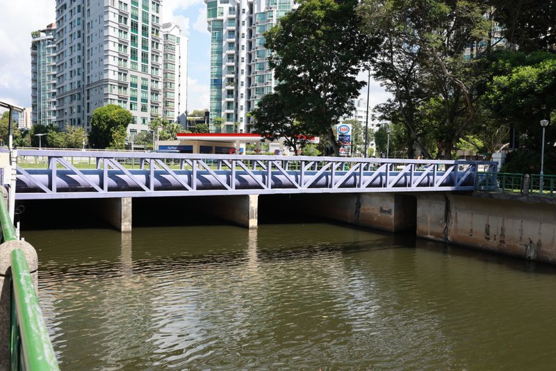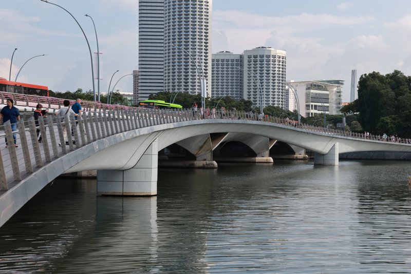 Brückentyp: Stahlbogen mit Holzbalustrade und Decking.