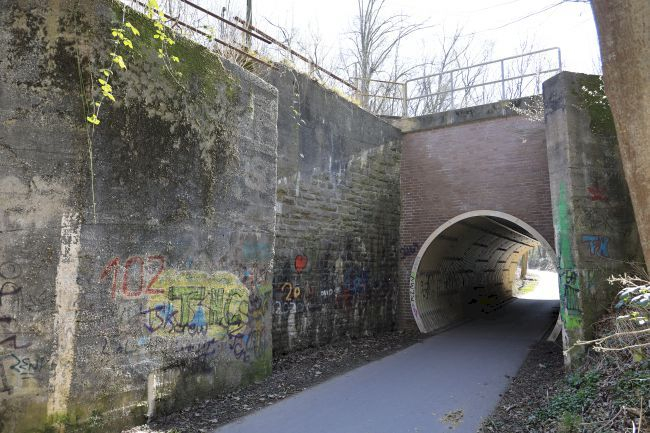 Die ehem. Eisenbahnbrücke wurde für die neue Wellblechbogenbrücke verfüllt.