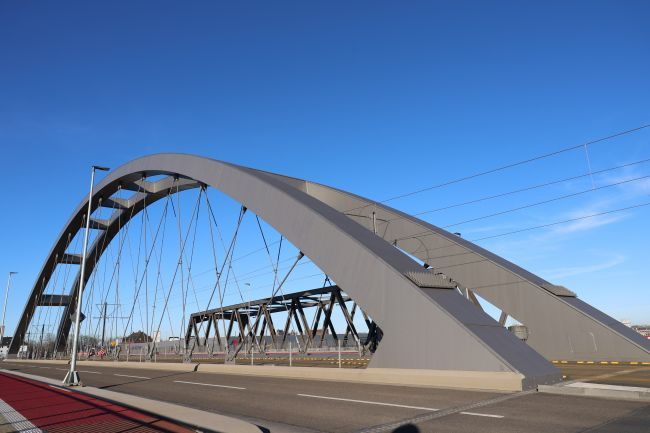 Bogenbrücke, Bogen über der Fahrbahn, Stabbogenbrücke