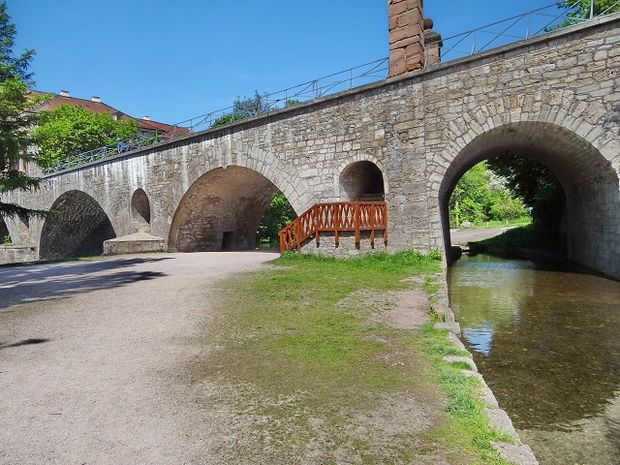 Informationen von Heidi Zengerling: Östlich des Schlosses über die Ilm in die Leibnizallee führt die steinerne Brücke, deren Name vom unmittelbar südlich gelegenen "Stern", einem ehemals frühbarocken Schloßgarten, herrührt. Früher hieß sie Schloßbrücke. Die Sternbrücke entstand beim Wiederaufbau des Schlosses durch Wilhelm IV. 1651-53 nach dem Entwurf und unter Leitung von Johann Moritz Richter. Sie ist die älteste erhaltene Brücke Weimars. Drei in den Zwickeln mit Entlastungsgewölben von 2,75 bzw. 2,20 m Durchmesser (Hochwasserdurchlässe) versehene Bögen überspannen den Fluß. Ein vierter, kleinerer Bogen wurde später an der Ostseite hinzugefügt. Er ersetzte die dort anfangs vorhandene hölzerne Zugbrücke, deren mit Kugeln bekrönte Kettenpfeiler noch auf der Brücke stehen. Das Brückengeländer schuf Clemens Wenzellaus Coudray um 1820. Ein in der Brücke zum Park hinunter führender Treppendurchgang war vermauert und wurde bei der Sanierung der Brücke 1994/95 wieder geöffnet. Kurz unterhalb der Brücke endete der gegen 1800 zugeschüttete Floßgraben. Wenig flußaufwärts an der heutigen Naturbrücke von der Ilm Mitte des 17. Jh. abgezweigt, führte er das herangeflößte Holz auf die Lagerplätze am rechten Flußufer südlich und nördlich der Sternbrücke.