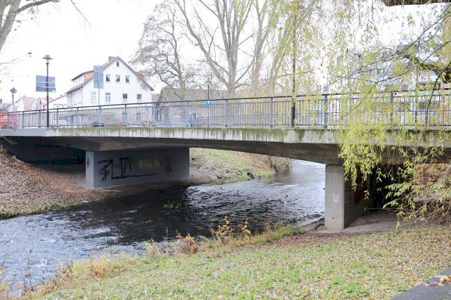 Wikipedia: Die Handelsstraße nach Thüringen nutzte im Mittelalter an der Stelle der heutigen Brücke eine Furt durch die Itz. Dort entstand in den Jahren 1401 bis 1407 zur Verehrung einer Heilig-Kreuz-Reliquie eine größere Kapelle, die spätere Heilig-Kreuz-Kirche. Zusätzlich wurde 1398 ein Holzsteg errichtet. 1465 folgte als Ersatzbauwerk die erste Steinbrücke Coburgs, die 1552 ein Hochwasser zerstörte. Der Wiederaufbau war 1555 abgeschlossen. Unter Herzog Casimir folgte 1618 der Bau einer Bogenbrücke mit vier öffnungen. Das Hochwasser mit Eisgang im Februar 1784 beschädigte die Brücke schwer. 1861 wurde die Brücke um zwei Bürgersteige verbreitert, außerdem die Montage von eisernen Geländern als Absturzsicherung durchgeführt. Wachsender Straßenverkehr ließ eine weitere Verbreiterung auf 9 Meter im Jahr 1893 folgen. 1952 wurde für die Fußgänger ein Notsteg errichtet bis schließlich die heutige Brücke im Mai 1956 dem Verkehr übergeben wurde. Es ist eine dreifeldrige Stahlbetonkonstruktion.[2] 12.000 Fahrzeuge passieren täglich das Bauwerk. Das etwa 40 Meter lange und 16 Meter breite Bauwerk weist drei Fahrstreifen und beidseitig Gehwege auf.[4]