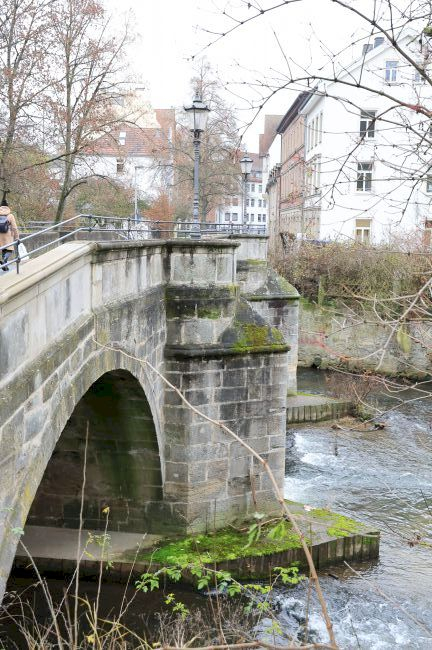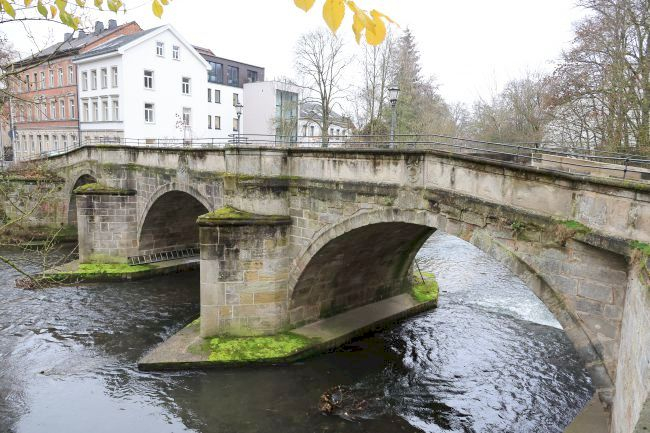Wikipedia: Die Judenbrücke ist eine gemauerte Bogenbrücke, die mit drei öffnungen die Itz überspannt. Das heutige Bauwerk wurde 1783 an der engsten Stelle der Itz als Ersatz für eine Holzbrücke errichtet. Die Baumaßnahme führten der Holzbaumeister Johann Michael Roeder und der Steinbaumeister Meier durch. In den folgenden Jahrhunderten erfuhr das Bauwerk mehrere Umbaumaßnahmen zur Verstärkung der Konstruktion und dient heut noch als Straßenbrücke für den Anliegerverkehr.