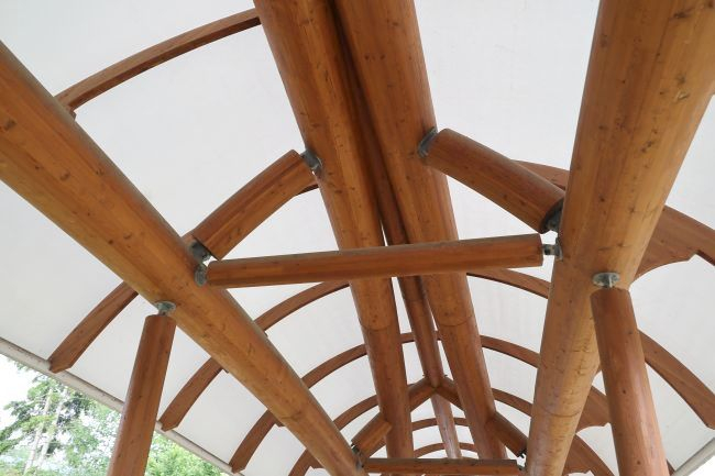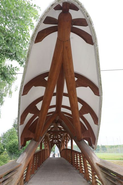 Für die gesamte Tragkonstruktion wurde verleimtes Brettschichtholz aus Lärche verwendet. Der Gehbelag besteht aus Eichenholz aus dem regionalen Wald. Ein weißes Membrandach aus einer Hightech-Folie überspannt die gesamte Brücke. Alle Bauteile wurden als Einzelstücke individuell gefertigt.