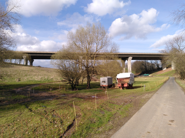 in unmittelbarer Nähe der Abendtalmühle Das Bauwerk liegt in einer Linkskurve mit R=9000 m sowie betreffs der Höhenentwicklung in einer Wanne mit R=27000 m mit einem mittleren Längsgefälle von 0,95% in Richtung Osten. Gebaut wurden zwei getrennte, 199 m lange Durchlaufträger mit Stützweiten von 29 m+ 3x47 m + 29 m. Das Bauwerk wurde als Sondervorschlag in Spannbeton anstelle des Amtsentwurf errichtet, der einen zweiteiligen Stahlverbundüberbau vorsah. Gewählt wurde je Überbau ein zweistegiger Plattenbalken mit 2,915 m auskragenden Fahrbahnplatte, so dass sich bei enem Stegabstand von 6,30 m ein ausgewogener Querschnitt ergibt. Die 1,50 m breiten Stege erhielten einen Anzug von 10 cm. Die Konstruktionshöhe beträgt 2,30 m. Die zwei nebeneinander angeordneten Überbauten sind durch je eine Pfeilerreihe gestützt. Der im Grundriss achteckige Pfeilerquerschnitt ist aus einem Rechteck mit den Abmessungen 2 m mal 5 m entwickelt. Im Kopfbereich ist der Querschnitt zur Anordnung der Lager karitellartig zu einem Rechteck von 3m mal 8 m verbreitert. Charakteristisch für den Pfeilerquerschnitt sind die schrägen Seitenflächen und die beiseitigen, 1,20 m breiten und 0,35 m tiefen, rechteckigen Einschnürungen. Die Abschrägungen und Aussparungen schaffen deutliche Licht- und Schattenzonen an den Pfeilern und ermöglichen auch bei Schrägdurchsicht einen freieren Durchblick unter der Brücke. Die Pfeilerbreitseiten erhielten einen Anzug von 1:80. Bauausführung durch: Schachtbau Nordhausen GmbH, Spezialtiefbau durch Bauer Spezialtiefbau GmbH