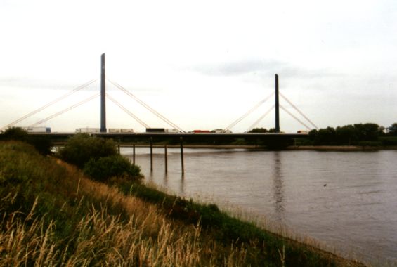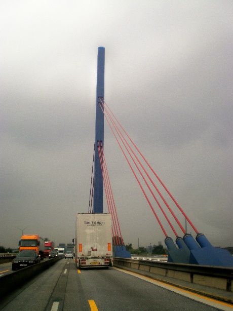 Pylon 52 m hoch und ragen spitz zulaufend über die Seilbefestigung hinaus, Schrägseilbrücke, Harfensystem, seilverspannte Mittelträgerbrücke über 5 Felder