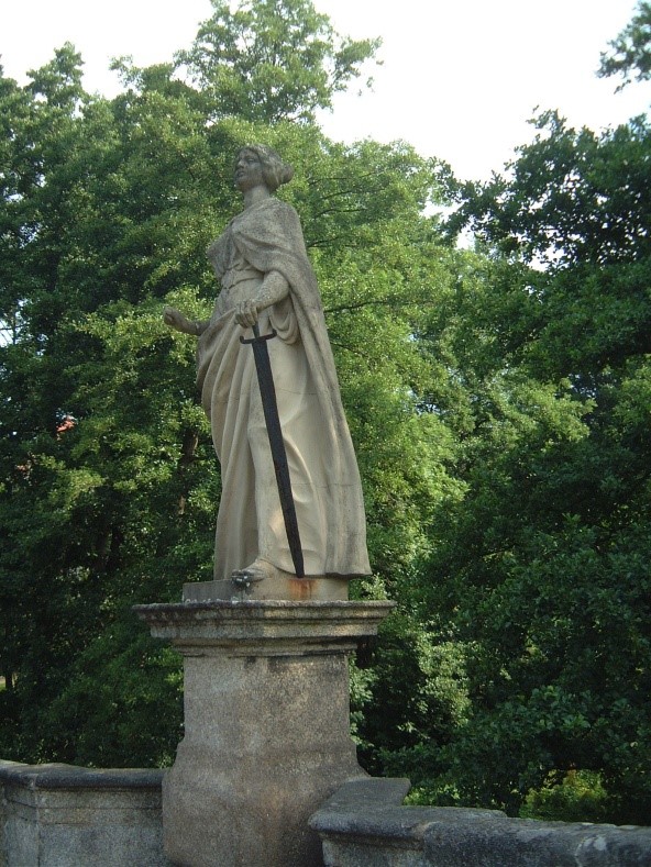 In der Mitte der Brücke befinden sich die Statuen der römischen Göttin des Ackerbaus, der Ehe und des Todes Ceres und die römische Göttin der Gerechtigkeit und des Rechtswesens Iustitia.