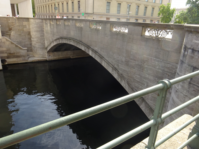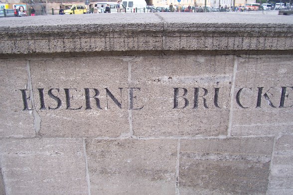 Mitte (Friedrichswerder/Alt-Cölln), führt über den Kupfergraben zwischen der Straße Hinter dem Gießhaus und der Bodestraße. 1796/97 entstand hier statt einer hölzernen Klappbrücke die erste gußeiserne Brücke Berlins. Sie wurde wegen ihres hochgewölbten Bogens auch Hohe Brücke genannt und war in der Königlichen Eisengießerei in Malapane (Schlesien) gefertigt worden. Der Name Eiserne Brücke blieb auch nach ihrer Neuausführung in Sandstein 1825 erhalten. 1914–1916 errichtete Walter Koeppen (; 1877) die heutige steinverkleidete Eisenkonstruktion. Bei einer Breite von 21 Metern überspannt diese einbogig den 20 m breiten Spreekanal. Die ebenfalls aus Muschelkalkstein gearbeitete Brüstung enthält in 16 Öffnungen bronzene Gitter, verziert mit Ranken und Blattwerkmotiven, Knaben- und Mädchengestalten. Das im II. Weltkrieg stark beschädigte Bauwerk wurde 1950 behelfsmäßig, 1968 unter originalgetreuer Wiederherstellung der Brückengeländer rekonstruiert. Die Eiserne Brücke steht unter Denkmalschutz. (Infos von www.luise-berlin.de)