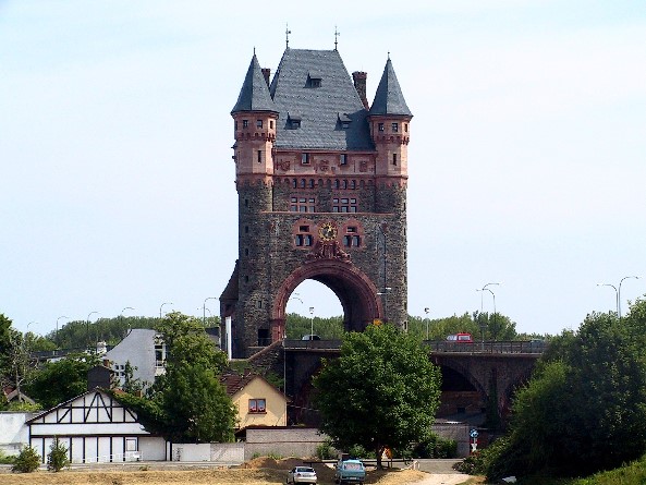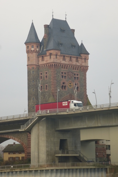 Der Brückenturm stammt nicht aus dem Mittelalter, sondern ist im Nibelungenbaustil gebaut worden. Der Brückenturm auf der anderen Rheinseite wurde im 2. Weltkrieg zerstört. Die Brücke erhielt 1990 wieder Ihre Turmhauben, die im 2. Weltkrieg abgenommen wurden um FLAK zu installieren. Das Mittelteil zwischen den ehemals 2 Brückentürmen wurde 1961 neu gebaut (Beton statt Eisen), der Brückenturm auf Wormser Seite restauriert. Der Turm auf Hessischer Seite wurde abgetragen. Die zweite, parallele Brücke wurde 2008 in Betrieb genommen und gestattet nun 4-spurigen Verkehr auf der B 47.