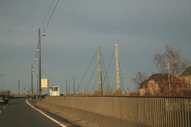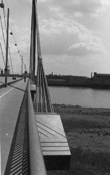 Die Kniebrücke verbindet seit 1969 im Rheinknie mit einer 320 m weiten Schifffahrtsöffnung die Friedrichstadt südlich der Innenstadt mit dem linksrheinischen Stadteil Oberkassel. Die östliche Auffahrt beginnt schon am Ständehaus und überquert die Uferstraße bereits in Brückenhöhe. Zwei 115 m hohe Pfeiler tragen die Brückenkonstruktion. Unmittelbar neben der Brücke entstand der Rheinturm der Bundespost.