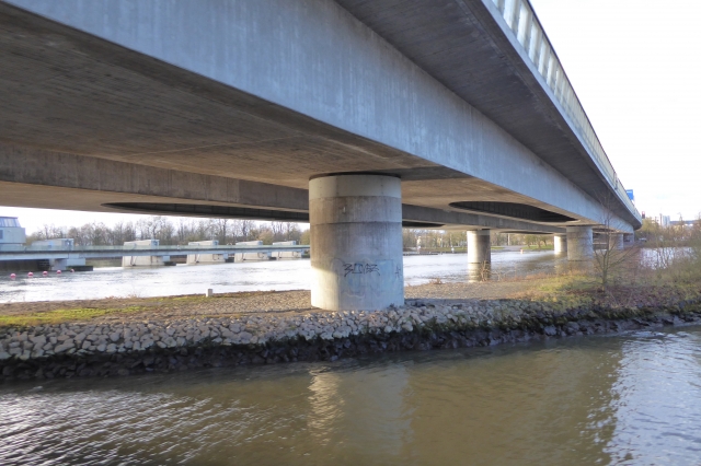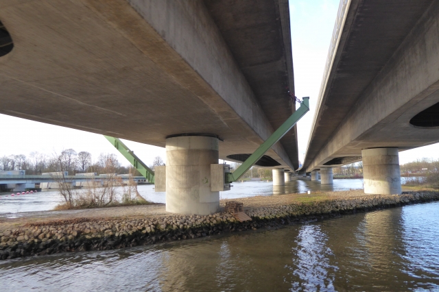 Die Spannbetonbrücke weist sieben Felder mit Spannweiten von 65 m − 80 m − 95 m − 88 m − 86 m − 78 m − 47 m auf. Der beiden Überbauten besitzen in Längsrichtung den Durchlaufträger mit einer konstanten Konstruktionshöhe als Bauwerkssystem. In Querrichtung ist als Bauwerkssystem ein zweistegiger Plattenbalken vorhanden. In den Pfeilerbereichen und Übergangsbereichen zu den Rampen sind aufgrund der hohen Druckkräfte die Plattenbalken unten mit einer Bodenplatte verbunden. Die vertikalen Stege besitzen im Feldbereich unten einen Flansch.