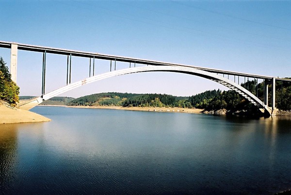 Die Brücke trägt den Namen des von der Talsperre überfluteten Ortes. Wassertiefe unterhalb der Brücke ca. 19 m. Vermutlich die größte einfache Zweigelenk-Vollwand-Stahlbogenbrücke in der Welt