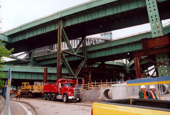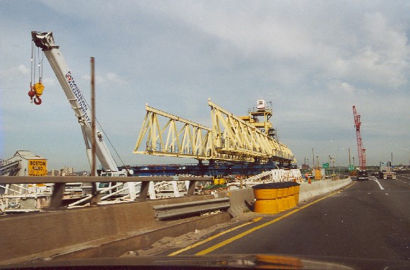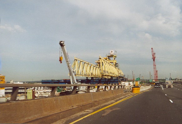 8 Fahrstreifen der Interstate 93; 2 zusätzliche seitliche Fahrstreifen einer einseitigen Rampe, östlich neben den Pylonen.