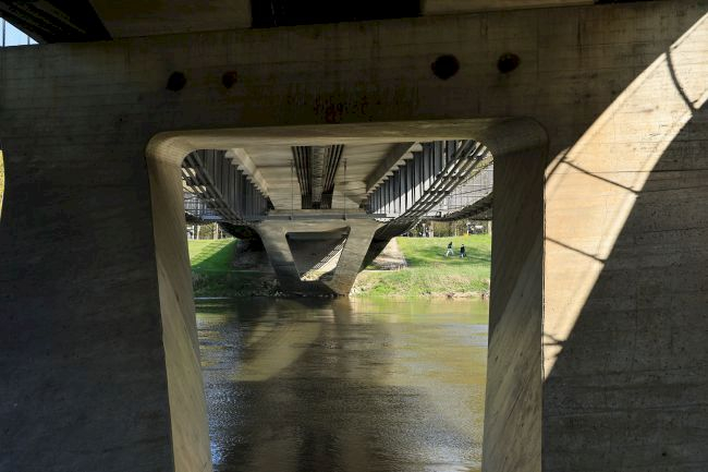 WIKIPEDIA: Die Glacisbrücke ist eine Straßenbrücke in Ingolstadt und wurde von 1996 bis 1998 erbaut, womit sie die jüngste der vier, für den Straßenverkehr freigegebenen Donaubrücken in Ingolstadt ist. Sie ist Teil des Ingolstädter Ringstraßensystems und die westlichste Straßenbrücke in der Stadt. Die Glacisbrücke wird täglich von rund 50 000 Fahrzeugen passiert. Benannt wurde die Brücke nach dem Glacis dem einstigen Festungsgürtel und heutigen Park, der die Altstadt Ingolstadts umschließt. Dabei wurden die Ingolstädter Bürger bei der Benennung der Brücke einbezogen und konnten aus drei Namensvorschlägen wählen. Das Bauwerk hat eine Gesamtlänge von 164 Meter, wobei ihre Auffahrt südlich der Donau durch Luitpoldpark führt und diesen teilt. Die 12 Meter breite Fahrbahnplatte besitzt einen 70 Zentimeter hohen, zweistegigen Plattenbalkenquerschnitt, der in den Seitenfeldern über 42 Meter, beziehungsweise 46 Meter und in der Mitte über 76 Meter spannt sowie durch eine Seilunterspannung gestützt wird. Die Unterspannung besteht aus jeweils vier Seilen mit 118 Millimeter Durchmesser. Vom Konstruktionstyp her handelt es sich bei der Glacisbrücke um ein Stahlbetonsprengwerk mit Seilunterspannung. Die Fuß- und Radwege werden seiltlich unterhalb der Fahrbahn mit Spannbandbrücken überführt, deren Gradiente als Berg- und Talfahrt dem Verlauf der Unterspannung der Fahrbahnplatte entspricht.