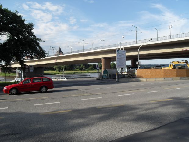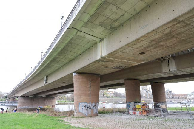 Diese Brücke wurde in der Bombennacht am 13./14. Februar zerstört. Nach dem Krieg wurde die heutige Stahlbetonbrücke errichtet.