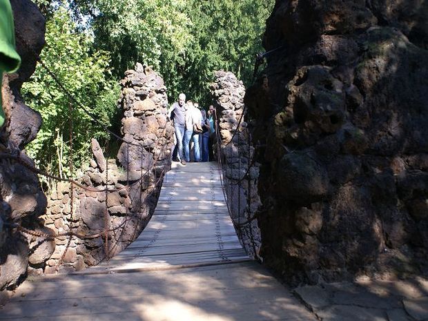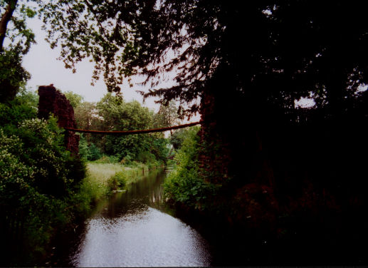 Starke Holzbretter auf Ketten, in Raseneisenstein verankert, Ketten als Geländer nachträglich zugefügt ((Gesamtlänge incl. Rampen))