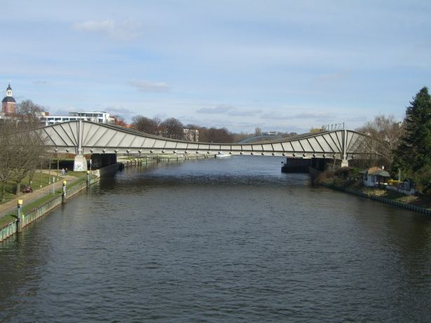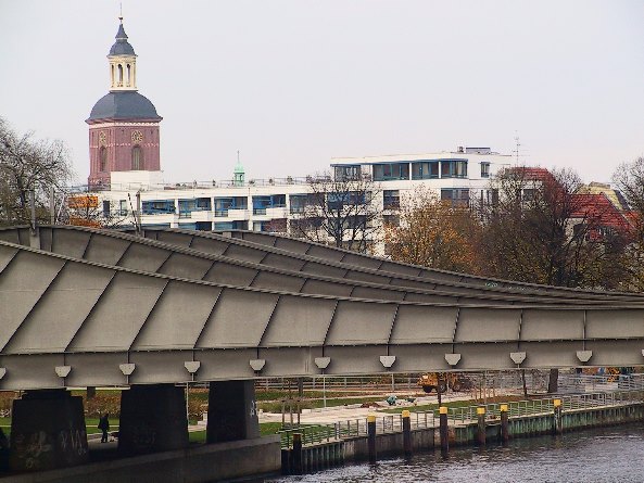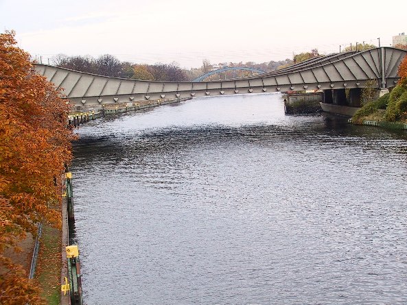 In der Morgenpost vom 27.12 o8 war der Bau einer neuen Fußwegbrücke über die Havel nahe dieser hier vorgestellten Brücke angekündigt worden. Ein Besuch zum Auffinden dieser neuen Brücke war jedoch nicht erfolgreich. Zu finden war ein Schild mit der Fertigstellung dieser Brücke am 31.1.09. Die Wirklichkeit sah anders aus.Man hatte diese neue Fußwegbrücke seitlich an der hier vorgestellten Brücke als Kragarm anmontiert.doch sie war nur im Bereich der Havel nicht jedoch in den Rampenbereichen hergestellt worden. Meine Bilder zeigen deshalb nur den Stand wie er am 4.3.09 vorgefunden wurde,