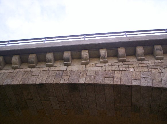 Die Stirnseite, die Widerlager und die Pfeilerabsätze sind mit Natursteinen aus Travertin und Muschelkalk verblendet.
