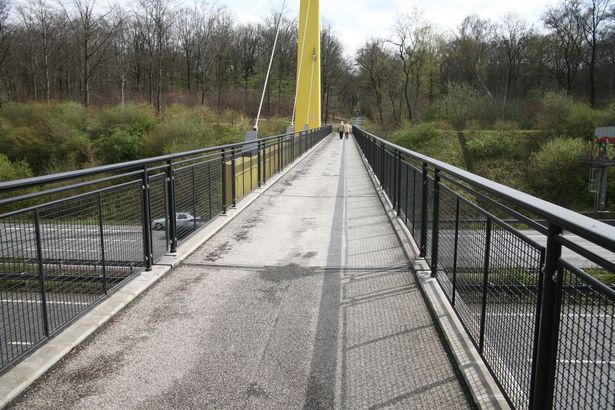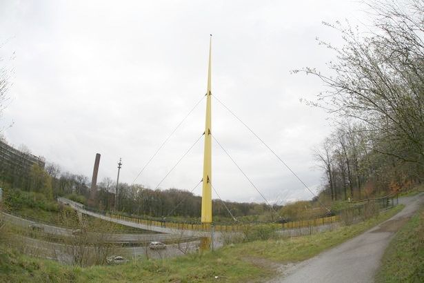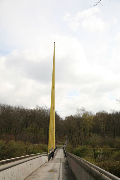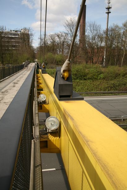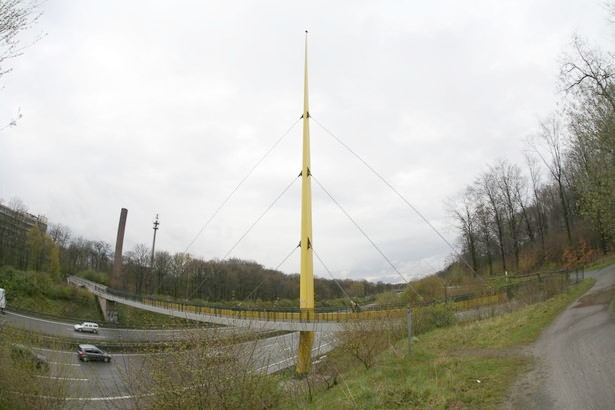 erster Einsatz war beim deutschen Pavillion auf der Weltausstellung 1958 in Brüssel, anschließend diente sie mehrere Jahrzehnte als Verbindungsbrücke zwischen den beiden Zoohälften des Duisburger Zoos über die Autobahn A3, 1998 wurde sie demontiert und für einige Monate im Autobahnkreuz Duisburg -Kaiserberg zwischengelagert bis sie ein paar hundert Meter südlich des Zoos wieder aufgebaut wurde. Aufgrund der breiteren Autobahn wurde am westlichen Widrlager ein kleiner Kragarm als Verlängerung eingebaut. Die Brücke besteht aus einem Torsionsversteifungsträger der an den Seilen hängt, und einem seitlich angebrachten Fußweg.