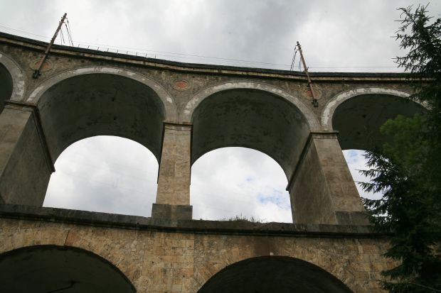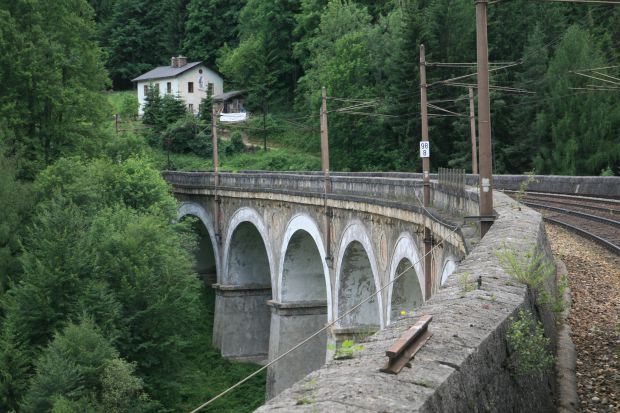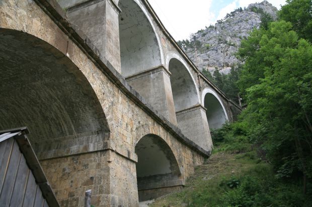 Höchster Viadukt der Semmeringbahn (erbaut 1848-1854, im Jahre 1998 zum UNESCO-Weltkulturerbe erklärt); 10 Bögen oben, 5 Bögen unten; Kalte Rinne Viadukt wurde auf dem alten 20 Schilling Schein abgebildet