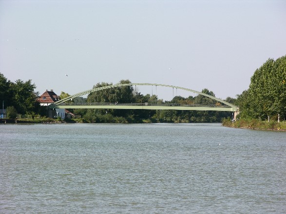 Bogenbrücke, Bogen über der Fahrbahn, Stabbogenbrücke