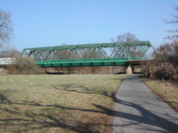 besteht aus drei verschiedenen Überbauten: eine Trogbrücke für die lokale Eisenbahn und eine neue und eine alte Fachwerkbrücke