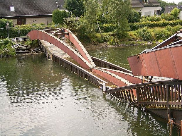 Wikipedia: Die Ernst-Müller-Brücke war eine Fußgängerbrücke über die Stauwurzel der Wupper-Vorsperre der Wuppertalsperre in Hückeswagen. Die Brücke stürzte im Juni 2008 ein. Die Brücke über den Aufstau des Fluss Wupper wurde 1985 erbaut und später zu Ehren des Ratsherrn Ernst Müller benannt[1], der sich für die Erschließung der Talsperre mit Wanderwegen und den Bau der Brücke eingesetzt hatte. Die Bogenbrücke wurde in Holzbauweise errichtet und ging 1999 von der Stadt Hückeswagen in den Besitz des Wupperverbands über. Im November 2006 wurde bei Routinearbeiten festgestellt, dass die Brücke aufgrund von Holzfäule einsturzgefährdet war. Sie wurde sofort für die Öffentlichkeit gesperrt. Ein Gutachten ergab, dass die Bogenbinder auf einer Seite verwittert waren.[2] Die Sperrung wurde von der Bevölkerung bedauert, da nun beliebte Rundwege unterbrochen waren und weite Umwege für die Erholungsuchenden zu bewältigen waren. Eine zur Wupper anliegende Firma erklärte sich nach einer Haftungsübernahme durch die Stadt bereit, einen Weg über ihr Gelände zu gestatten, so dass der notwendige Umweg deutlich verkleinert werden konnte. 2007 fiel die Entscheidung, die Ernst-Müller-Brücke durch ein neues Brückenbauwerk zu ersetzen. An der Ausschreibung nahmen sieben Bieter mit 23 Angeboten teil, von denen eine flache Stahlbrücke überzeugen konnte.[3] Zwei Wochen vor Beginn der Abrissarbeiten und dem Neubau stürzte die Ernst-Müller-Brücke am Abend des 24. Juni 2008 aufgrund der im Gutachten festgestellten Schäden ein.[4] Personen kamen nicht zu Schaden. Die Nachfolgebrücke wurde Anfang August 2008 errichtet.