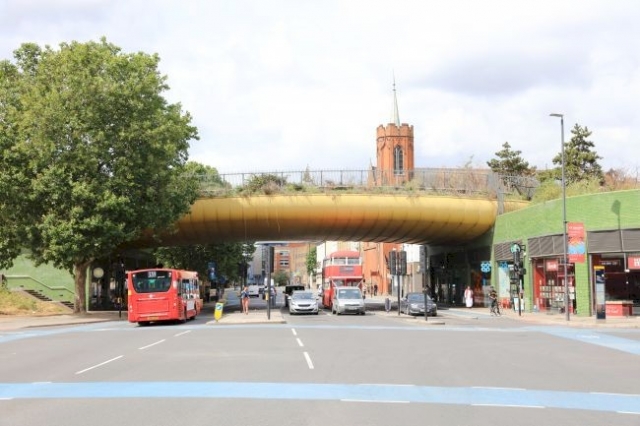 entworfen von Piers Gough, auf der Brücke befindet sich ein kleiner Park mit Bäumen