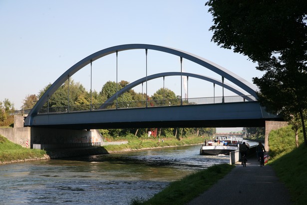 Bogenbrücke, Bogen über der Fahrbahn, Stabbogenbrücke