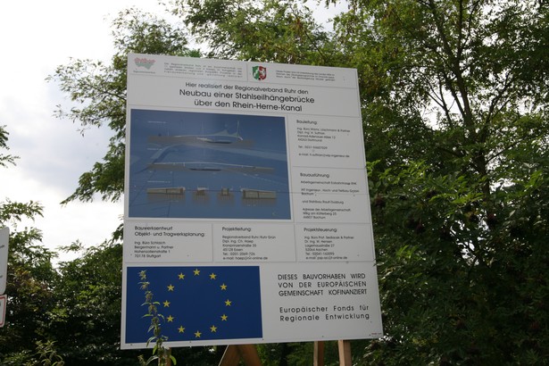 Die sichelförmige Stahlkonstruktion vom Ingenieurbüro Schlaich Bergermann und Partner aus Stuttgart überquert den Rhein-Herne-Kanal in einem halbkreisförmigen Bogen. Nur an einem 48 Meter hohen Stahlpylon auf der Nordseite des Kanals hängend, hat die geschwungene Brücke eine Spannweite von rund 150 Metern. Die nördliche, 37 Meter lange Rampe wird durch Betonstützmauern gebildet, die südliche, 34 Meter lange Rampe als Erddamm hergestellt. Verbaut werden über 600 Kubikmeter Beton und 235 Meter Großbohrpfähle für die Widerlager sowie 400 Tonnen Stahl und 465 Meter Seil für die Hängekonstruktion.