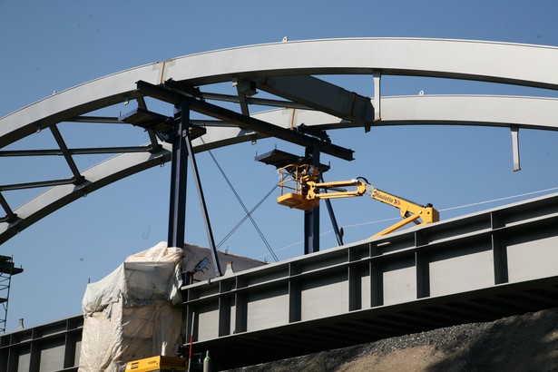 Vorgefertigter nördlicher Brückenteil bereit zum Verschub auf dem Montageplatz östlich der zukünftigen Brücke