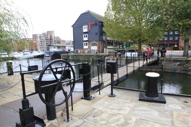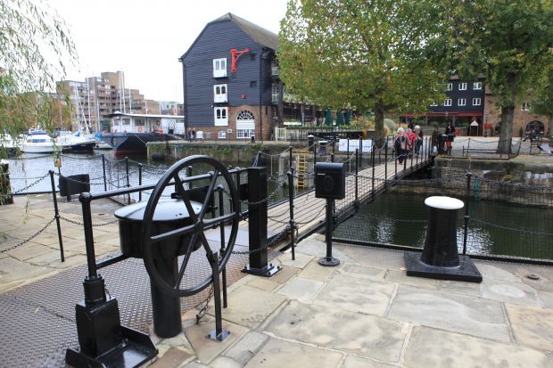 Dieser Nachbau wurde 1994 an dieser Stelle errichtet. Der Originalbau überbrückte die Einfahrt zu den Eastdocks seit 1829. Dessen Teile neben der heutigen Brücke.