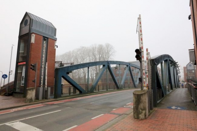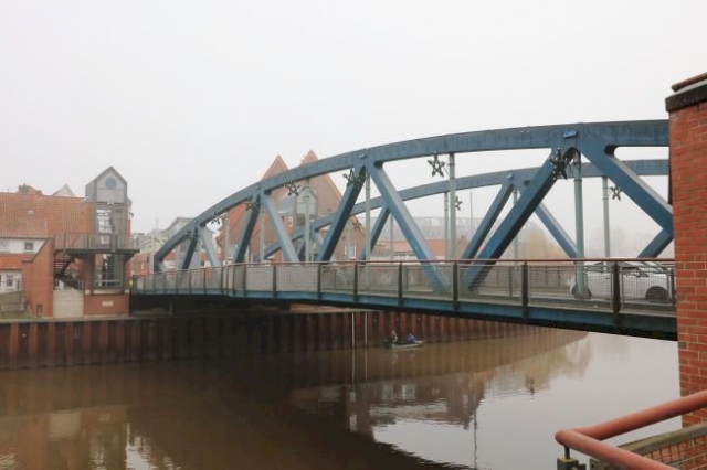bei hochgefahrener Brücke kann man als Fußgänger über eine Treppe auf die hochgefahrene Brücke gehen und den Kanal überqueren