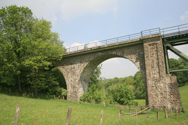 ``Die Bahnbrücke liegt östlich von Meinerzhagen im Verlauf der eingleisigen DB-Nebenbahnstrecke Meinerzhagen-Krummenerl. Sie wurde in den Jahren 1912 - 1914 erbaut. Das charakteristische Merkmal der Brücke ist das Stahlfachwerk, das auf zwei Teilstrecken aus gradlinigen überbauten und dazwischen angeordnet aus einem nach unten gerichteten Fischbauchträger besteht. Ergänzt wird das Stahlfachwerk durch eine nach Westen anschließende Massivbogenbrücke, bestehend aus 2 Brückenbögen mit Betonkern und Bruchsteinverkleidung. Brücken mit solchen Tragwerken sind in der Bundesrepublik Deutschland nur in geringer Zahl vorhanden. Die Brücke ist als technisches Baudenkmal geschützt.``