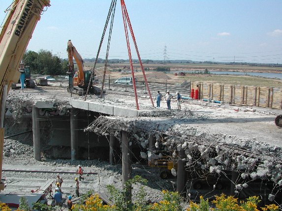 Im Sommer 2003 haben die Abrissarbeiten begonnen, um einen Neubau für die erweiterte Autobahn errichten zu können. Hierbei wurde am Sonntag (03.08.2003)die Eisenbahnstrecke gesperrt, die Betonplatte in Stücke geschnitten und mit einem 500-t-Autokran an der Seite angelegt.